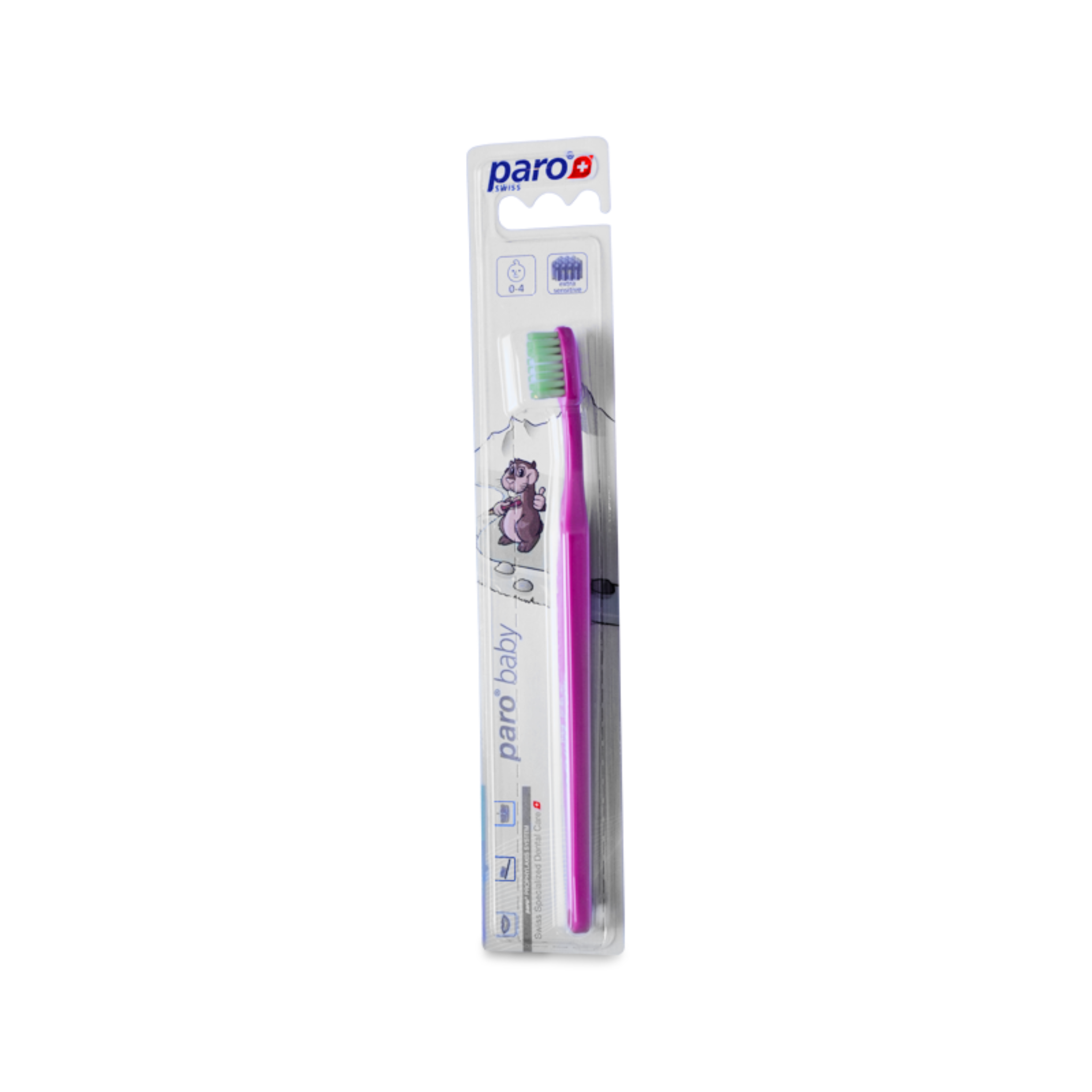 Die paro® baby Kleinkinderzahnbürste ist speziell für die Anwendung ab dem ersten Zahn entwickelt worden. Der kompakte Bürstenkopf mit abgerundeten und extra sensitiven Borsten ist zahnfleischschonend und erlaubt Eltern eine sanfte, optimale Nachreinigung der Zähne. Das weisse Borstenfeld indiziert die Erbsengrösse der zu verwendenden Zahnpaste.